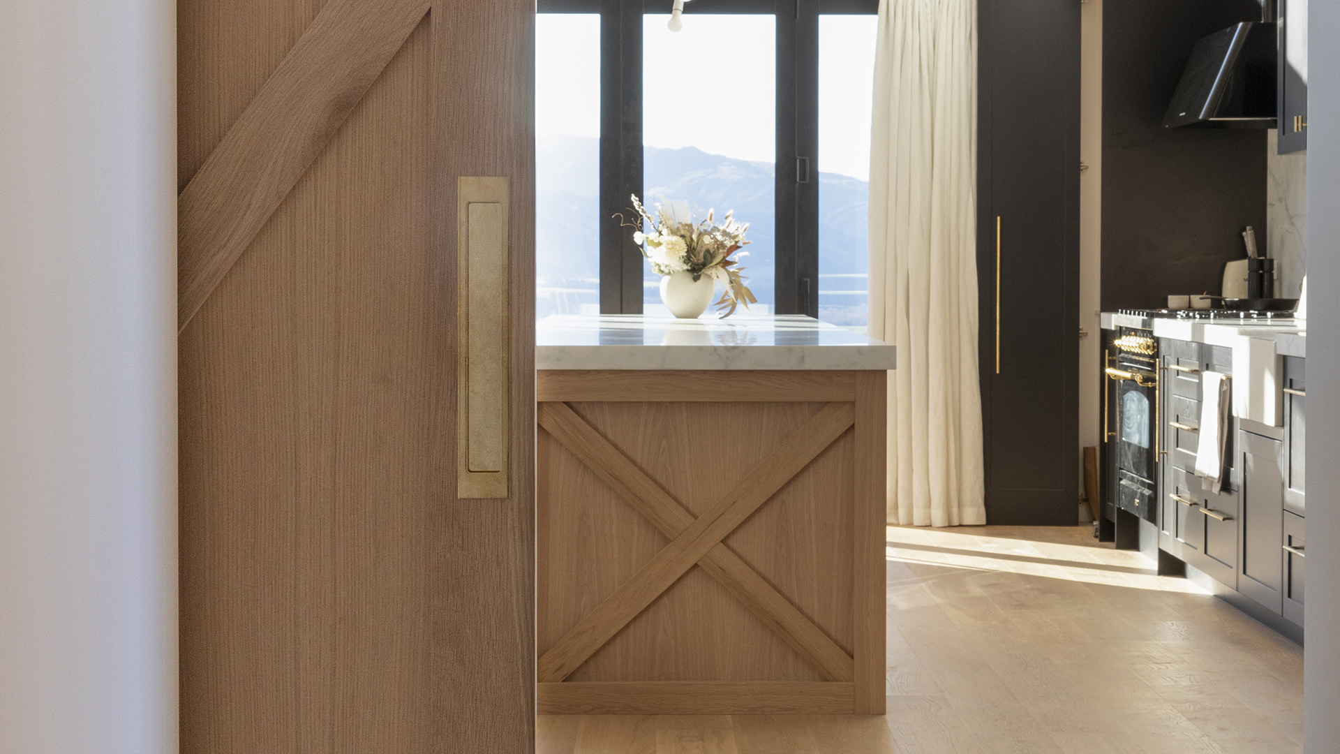 The custom oversized barn door, also made of American Oak, that had farmhouse crosses and matched the end of the kitchen benches. This feature door also coordinates perfectly with the cathedral ceilings and exposed beams in the living area.