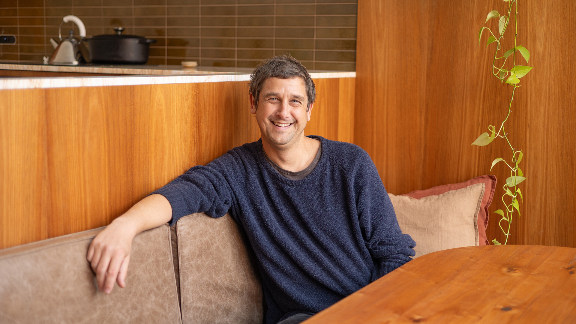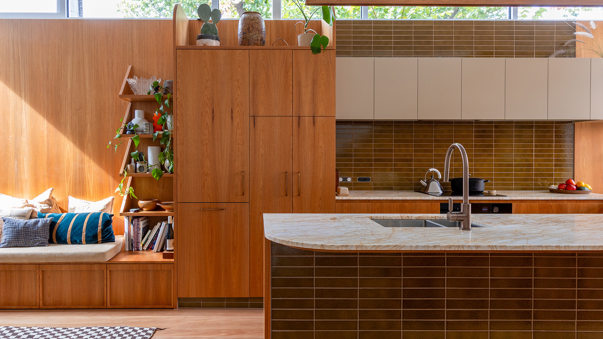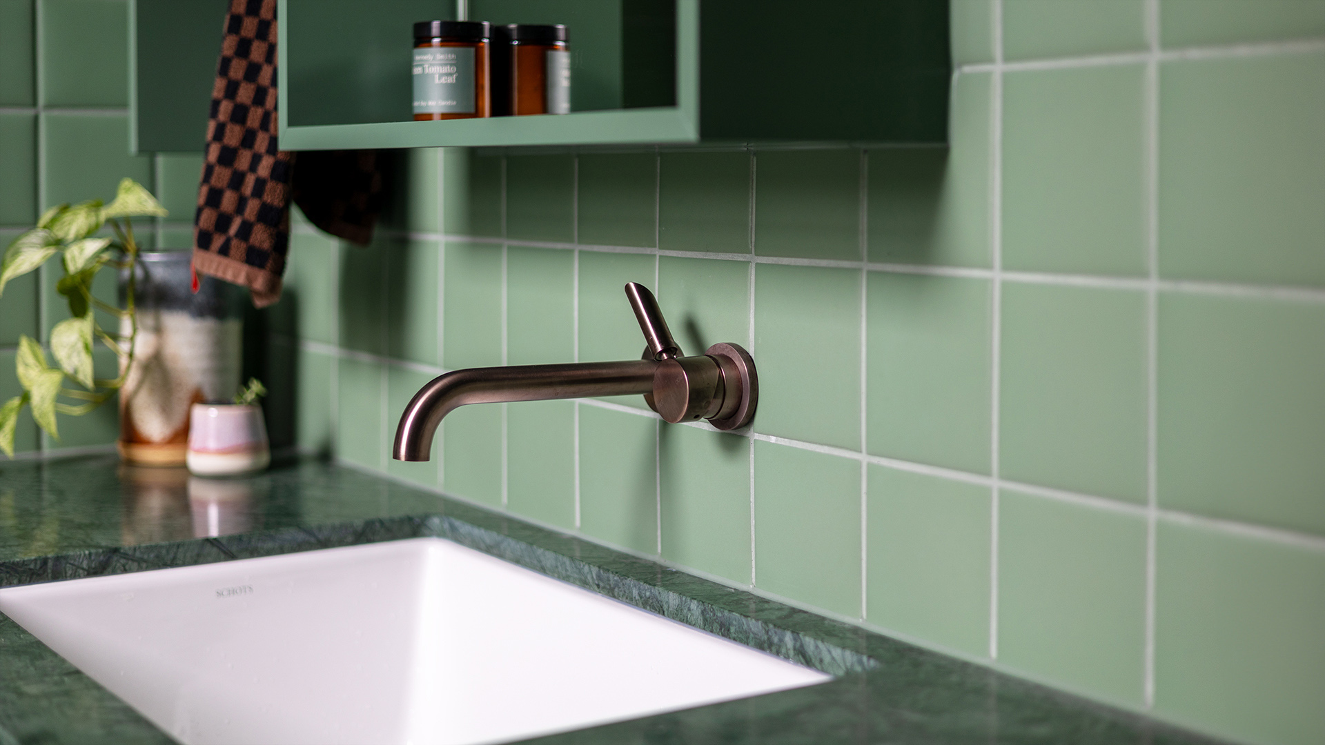 The Brodware tapware in Statue Bronze finish used in the kitchen and bathrooms and the bronze cabinet handles used on the kitchen joinery.