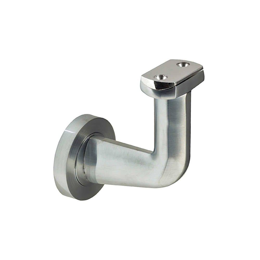 A Stair Rail Bracket with an adaptable curved and flat mount is designed to securely attach a handrail to either curved or flat surfaces, providing versatile support and stability for various installation needs.