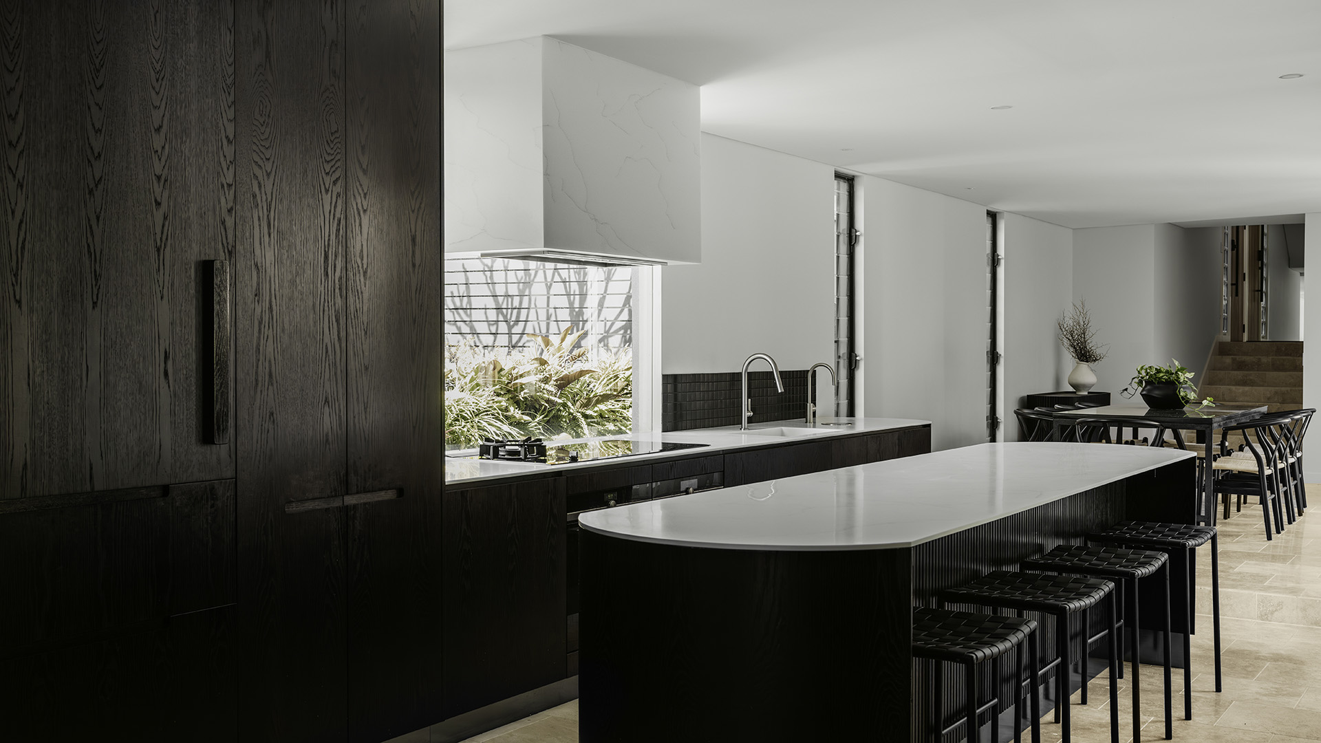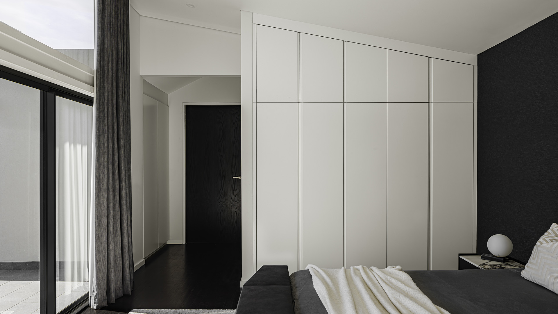 To fuse modern minimalism with natural elegance, crafting a space that is both contemporary and timeless. Crisp white walls create a spacious backdrop, allowing elements like dark stained timber joinery and natural stone flooring to stand out. These materials add depth and connect the interior to nature, while light grey sheer curtains softly diffuse light, maintaining a tranquil, airy atmosphere.