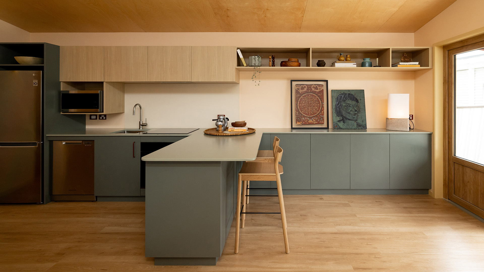 Also, the high windows, recommended by Ethan Hunter Architects, paired with beech ply ceilings, impart warmth and openness to the living area, enhancing the overall luminosity and ambiance.