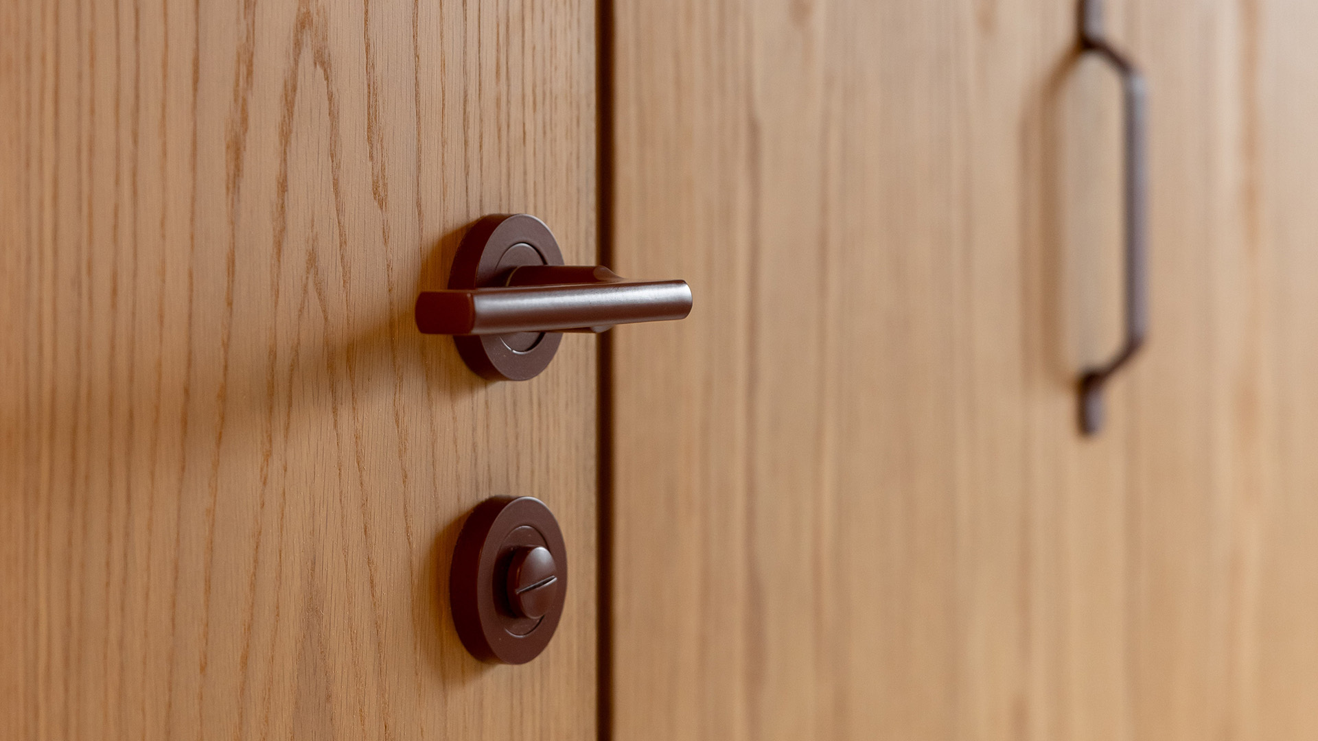 The hardware selection balanced user-friendliness for dementia patients with long-term aesthetic appeal for the future homeowners. The Apex lever, a simple yet timeless design, complemented the warm, textured interior with Japanese influences.