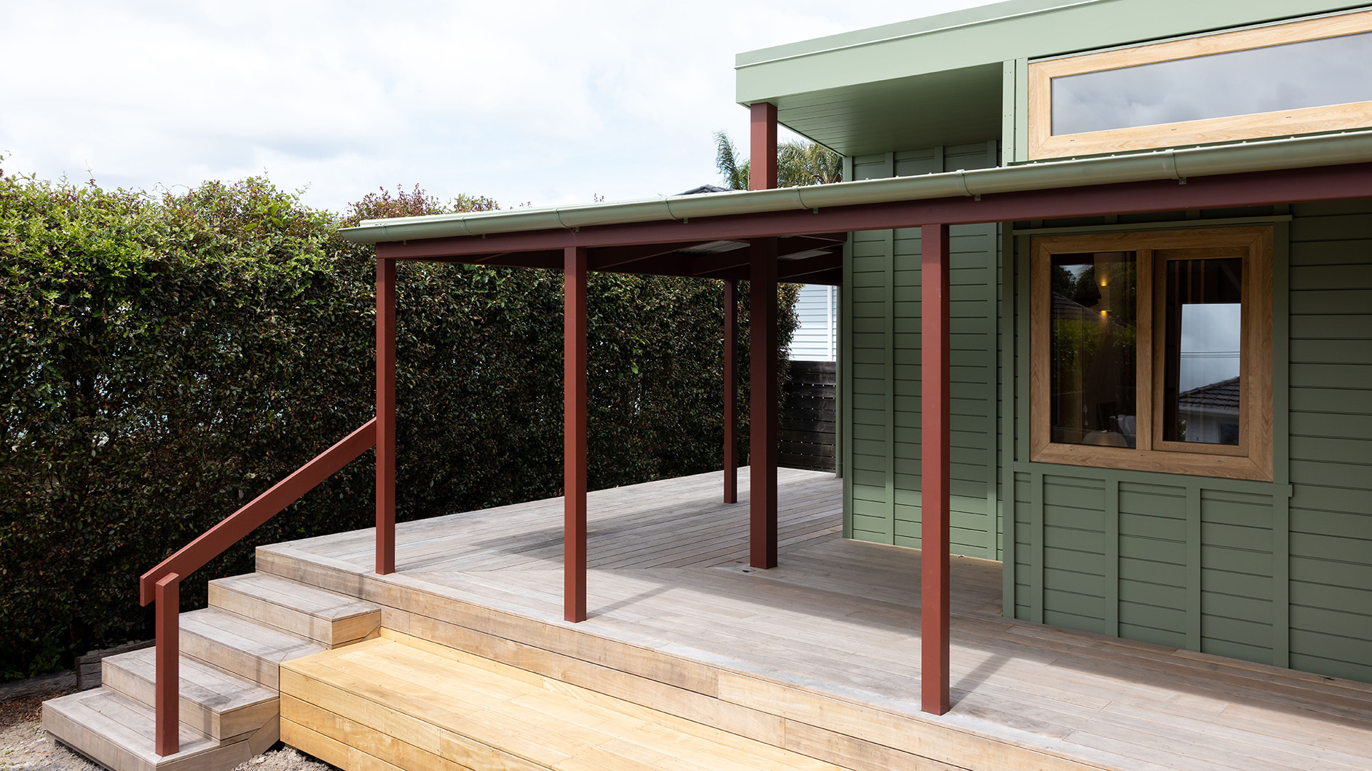 Their aim was to integrate outdoor elements indoors by applying the exterior Scoria colour used on the veranda to internal door and window hardware through powder coating.